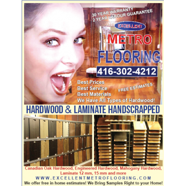 Excellent Metro Flooring Inc . is proud to say that we have been providing quality flooring services for GTA during the last 14 years. Our dedicated and professional employees are committed to doing their jobs efficiently and correctly. They have many years of experience in the flooring business and these shows in the work that they do. Most of our new customers are referrals from other satisfied clients. Hardwood floors add beauty, elegance and value to any home. We offer a range of services from installation of completely new flooring to refinishing old flooring. We also offer a large selection of hardwoods including Oak, Maple and Cherry, as well as more exotic woods, pre finished flooring, and laminate.